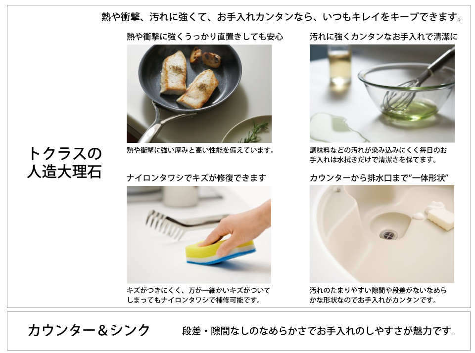キッチン天板、シンクは人造大理石で傷や熱に強く、いつも美しく使えます。