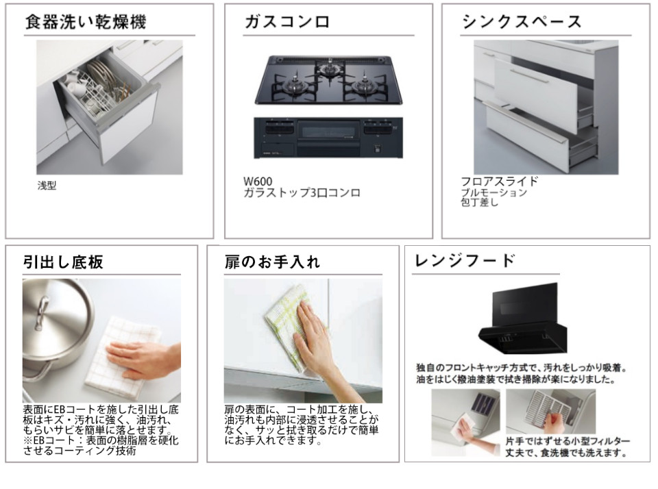 独自のフロントキャッチ方式で、汚れをしっかり吸着。油をはじく撥油塗装で拭き掃除が楽になりました。