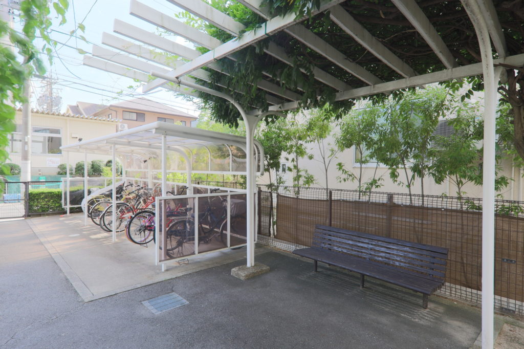 敷地内駐輪場は無償(ステッカー代300円)でご利用いただけます。休憩スペースとしてもお使いいただけそうなベンチも用意されています。