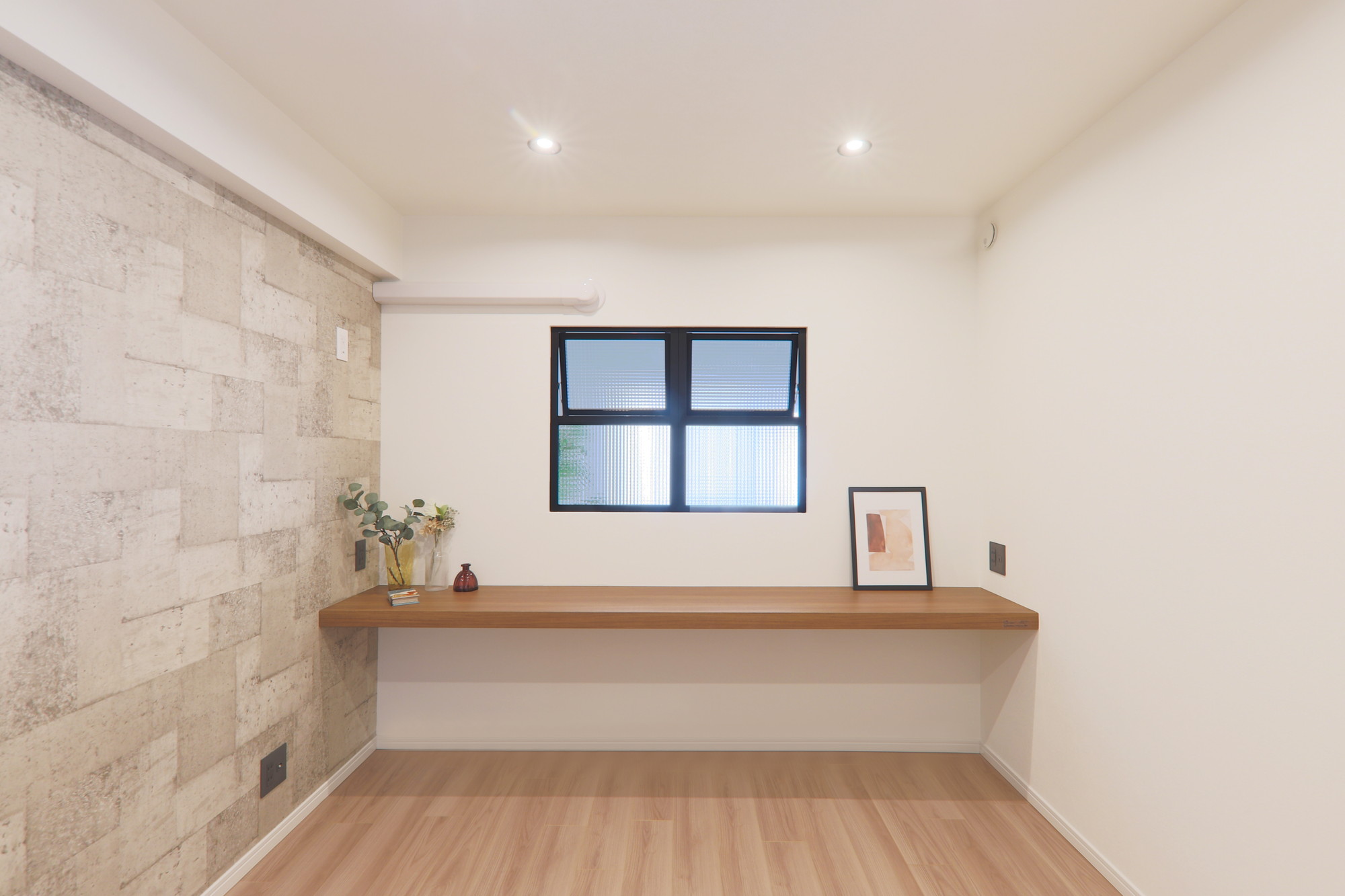 リビング隣にある洋室は室内窓をつけることで、ゆるやかに空間に繋がりをもたせています。デスクを造作していますので、ワークスペースはもちろんお子さまの勉強スペースにもお使いいただけます。
