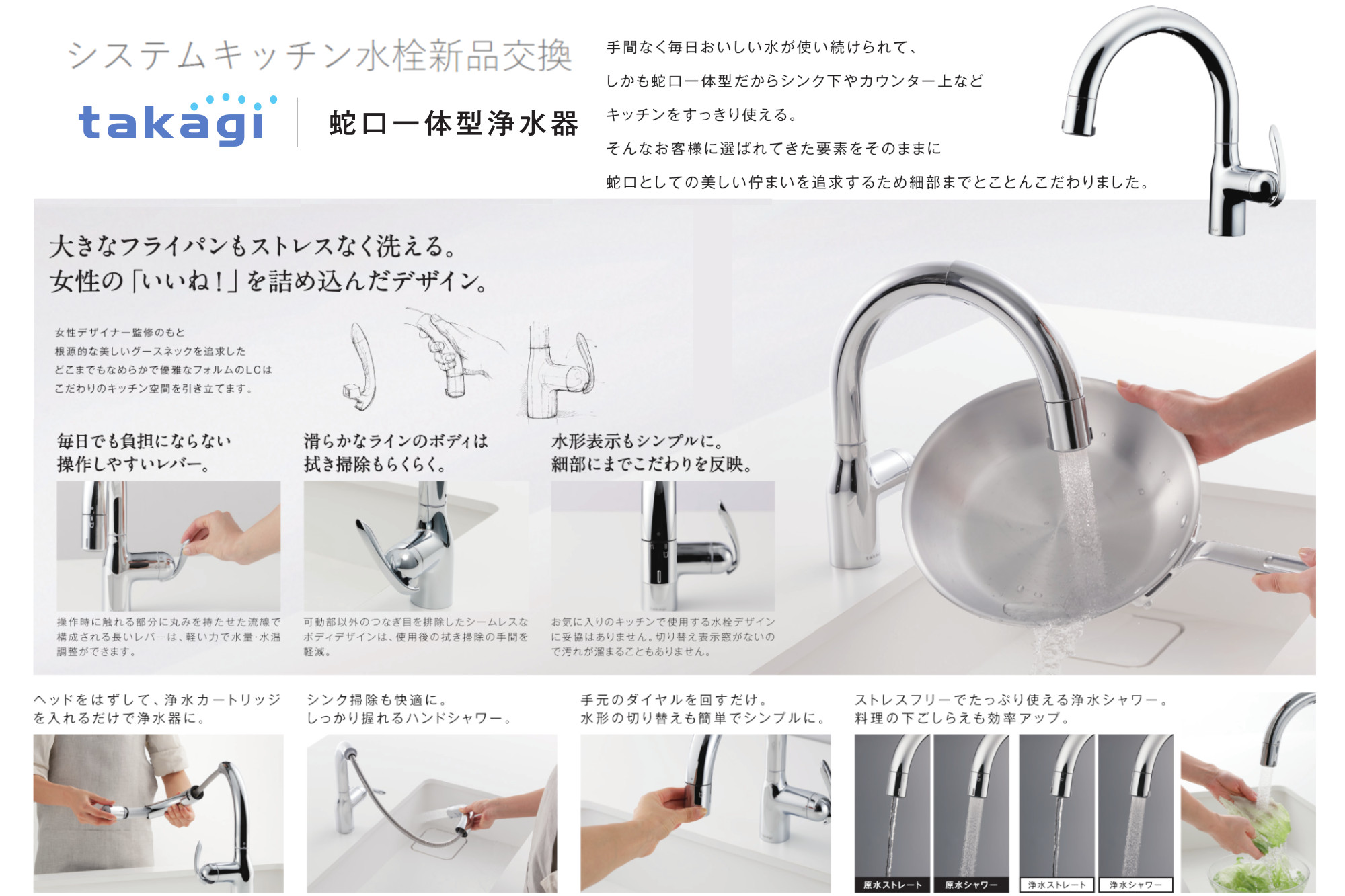 タカギの美しいグースネック水栓です。浄水機能はもちろん、シンク掃除も快適なハンドシャワーつきです。大きなフライパンもストレスなく洗えるデザインとなっています。