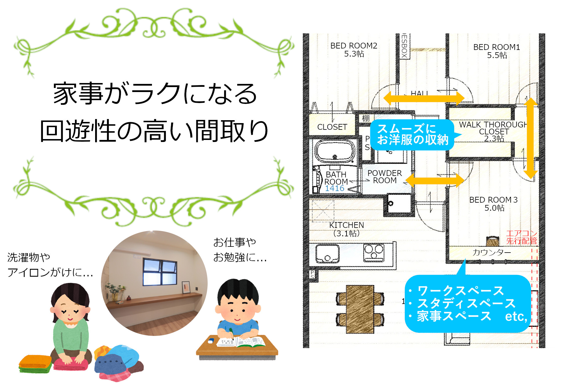いろんな用途にお使いいただけるデスク付の洋室、2.3帖のウォークスルークローゼットを設けました。洗面スペースから各居室へスムーズに動ける間取りとなっております。