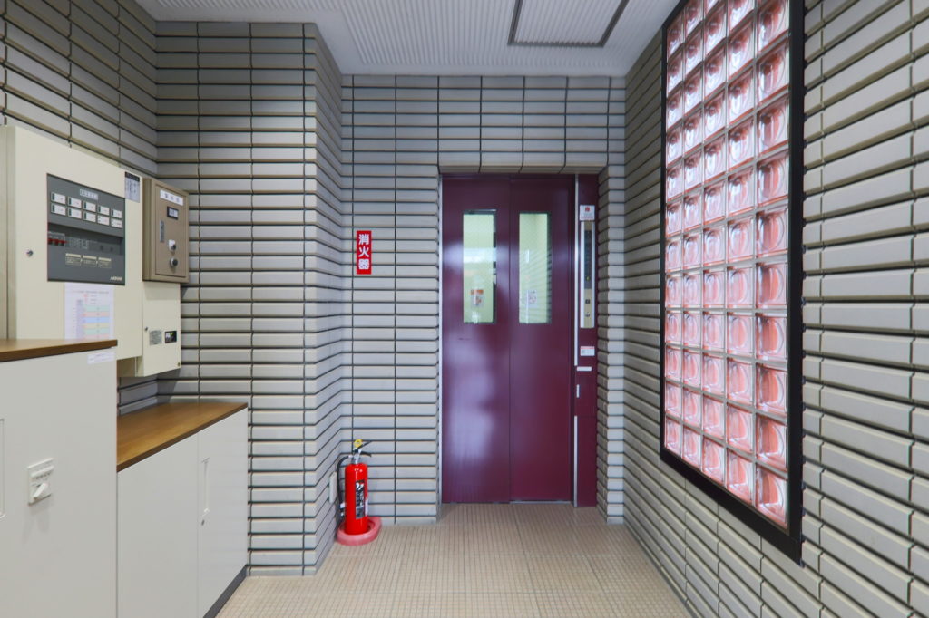 エレベーターホールです。ガラスブロックから光が入る明るい共用部となっています