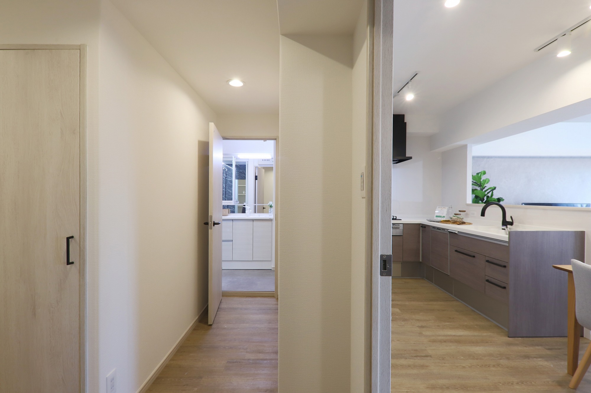 キッチンと洗面スペースが直接通行できる人気の間取りです。
