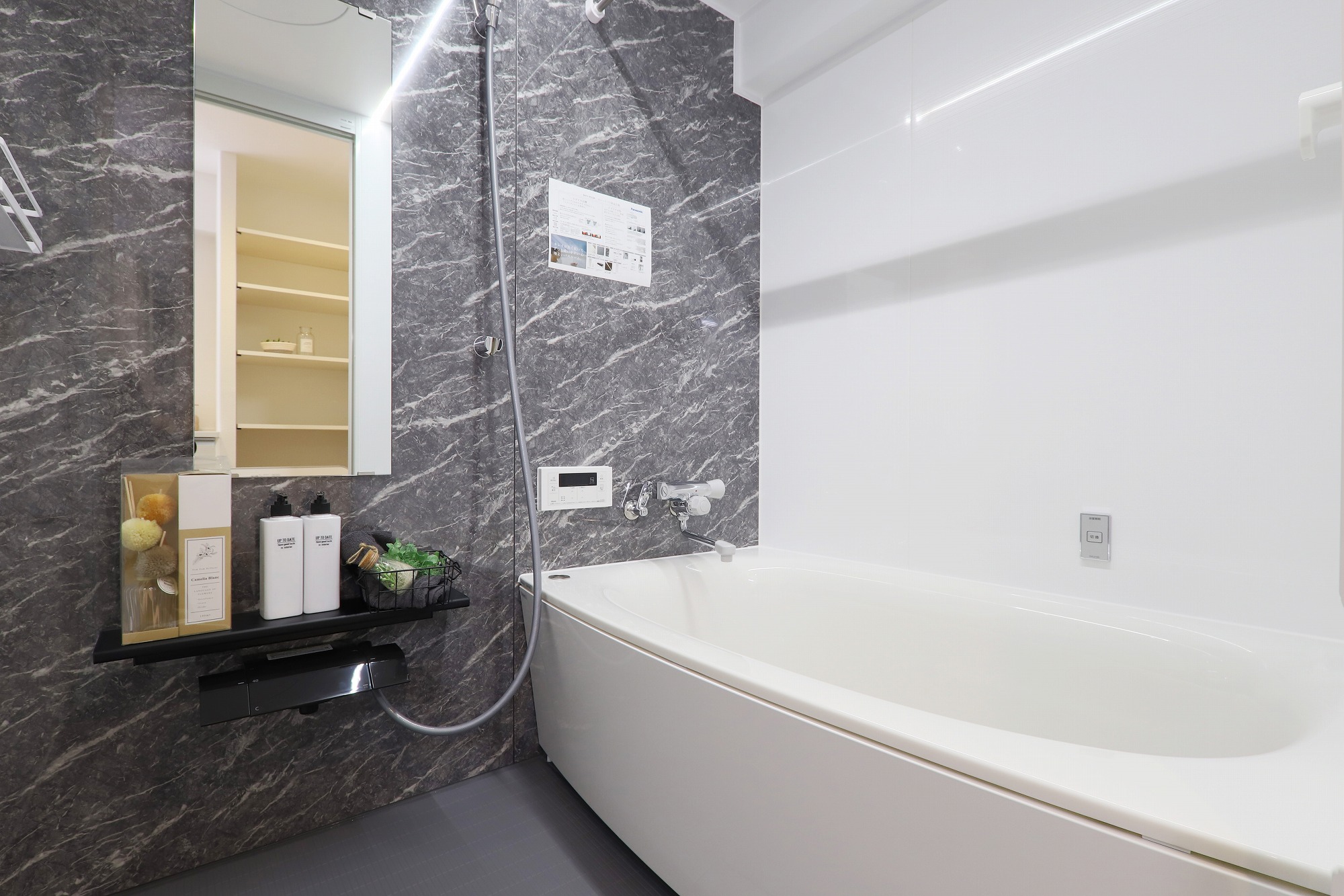「ラクシーナ」を採用しました。扉柄はグレーオーク柄を使っています。アクセント壁にはモダンクラシックなグリジオカルニコ柄を使うことで、重厚感のあるゆったりとしたバスルームに。