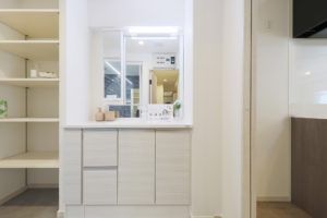 パナソニックの洗面化粧台を採用しました。棚がもともとありましたが、固定棚ではなくオープンな可動棚とすることで、住む方に合わせた収納を実現しています。