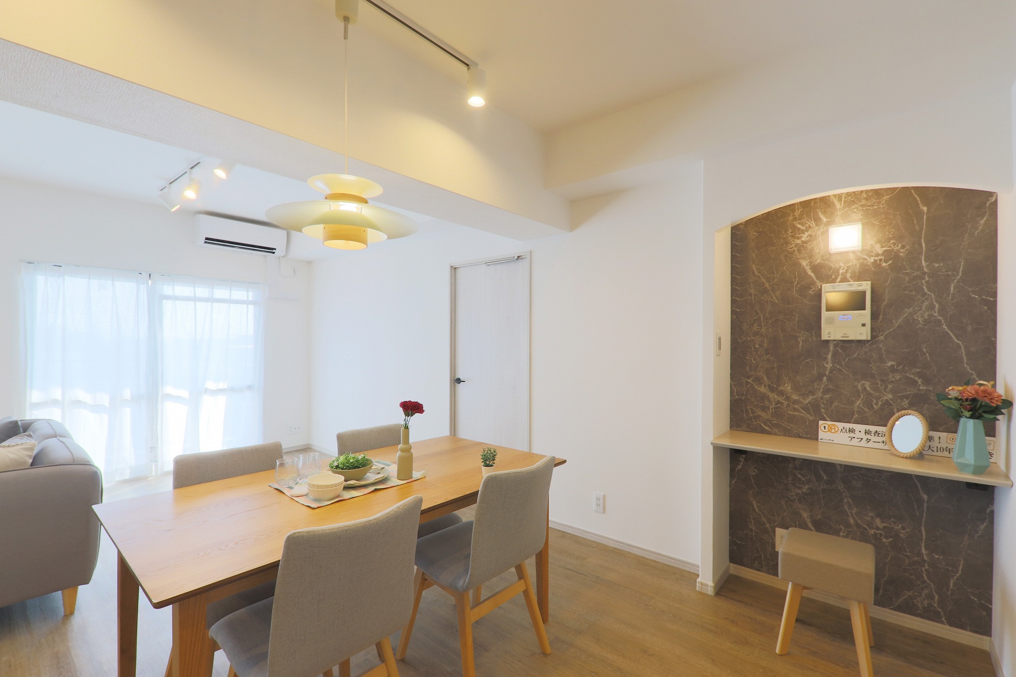 壁面にはマーブル柄が特徴の大理石柄のアクセントでデザイン性あふれる空間となっています。