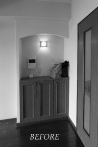 元々はインターフォン&棚のあるスペースでした。リビング脇にあるこの場所を有効活用いただけるようにデスクを設けております。