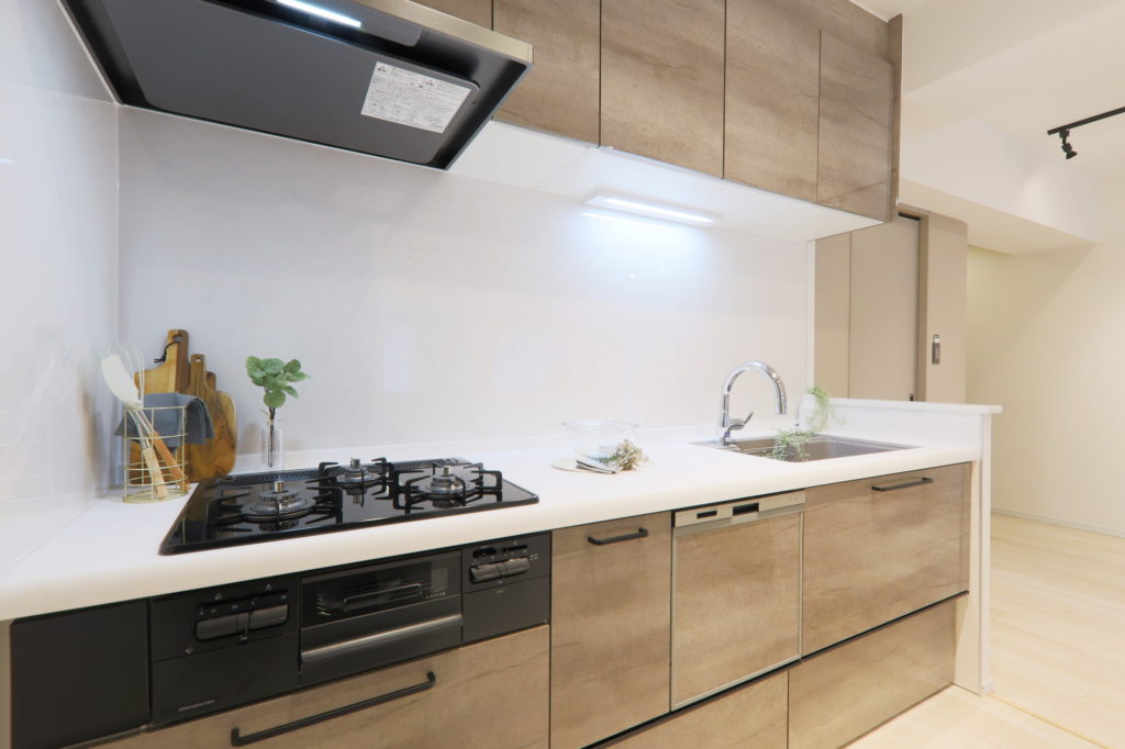 リビングに入ると、木目調クロスの壁を立てたキッチンが。