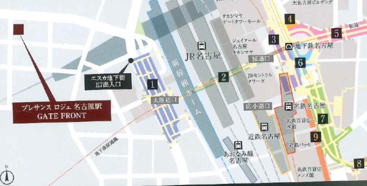 プレサンスロジェ名古屋駅ゲートフロントから、名古屋駅の新幹線口から最も近い場所にある「エスカ地下街」の入口へ、清正公通りをまっすぐ5分。様々な地下街に繋がっており、名鉄名古屋駅にも接続。ショッピングにグルメ、乗り換えなどの移動も、天候を気にすることなく快適です。