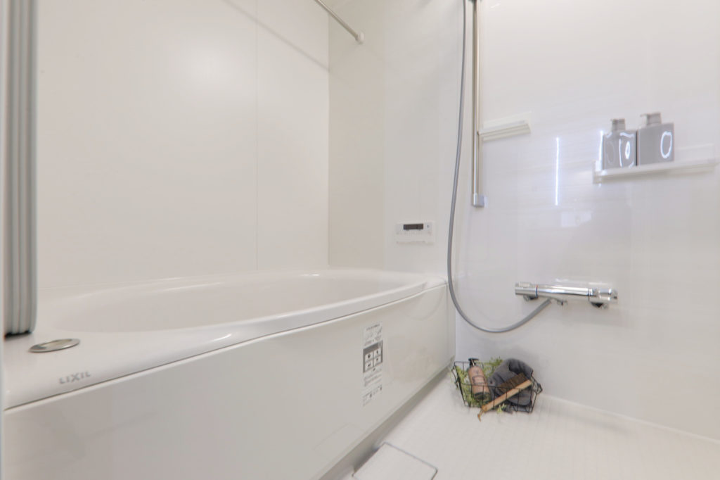 LIXILのユニットバスを使用しています。大理石のような上質な光沢の人造大理石浴槽ルフレトーン・空気を含んだ大粒の水滴が心地よい超節水シャワー・ダブルの保温構造でお湯が冷めにくいサーモバスなど充実した仕様となっています。
