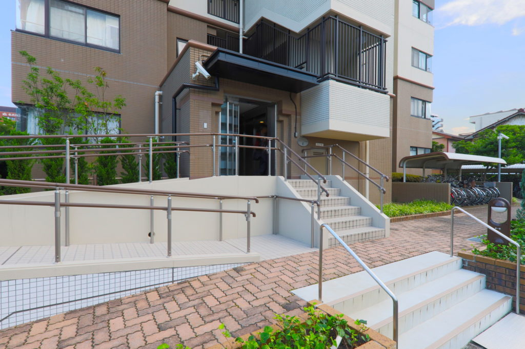 4号棟のエントランス前はスロープがあるため、ベビーカーを押しながらやトランクケースを持ってのご移動などに便利です。