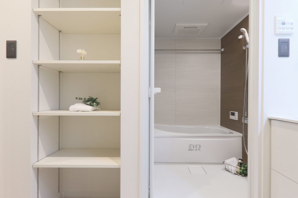 洗面スペースには可動棚を設けることで、リネン類をすっきりとご収納いただけるスペースとなりました。
