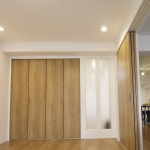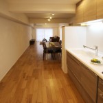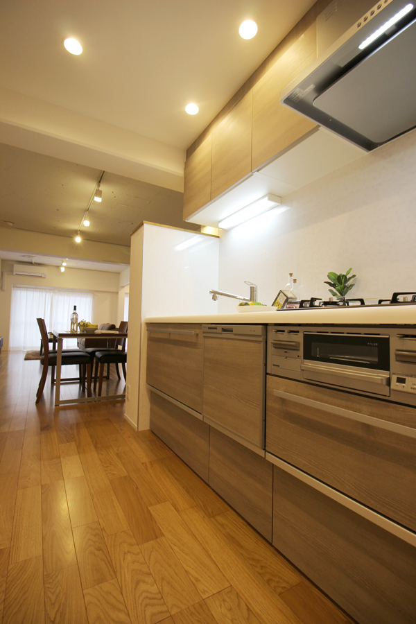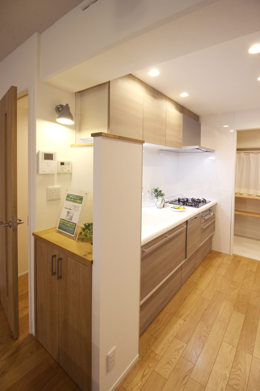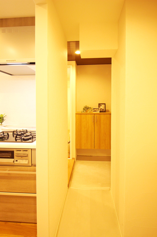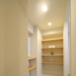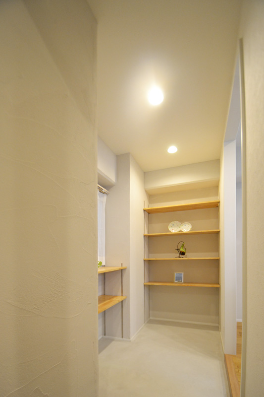- 玄関とキッチンを繋ぐ収納空間です。収納棚は可動式になっています。