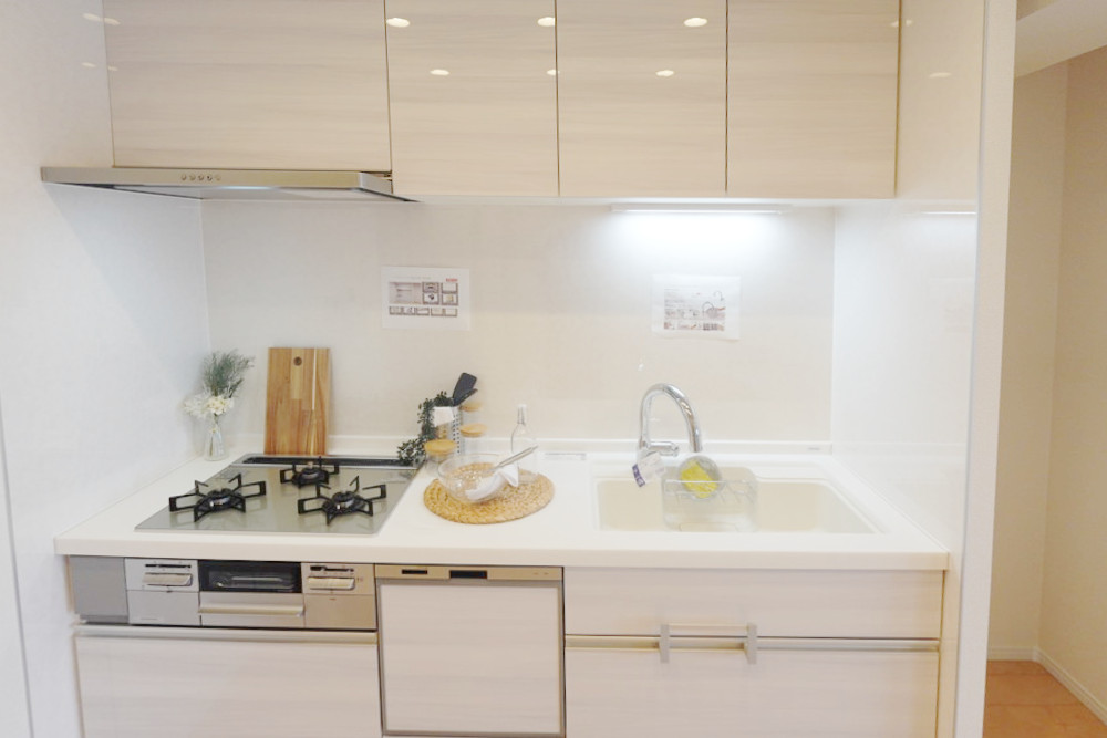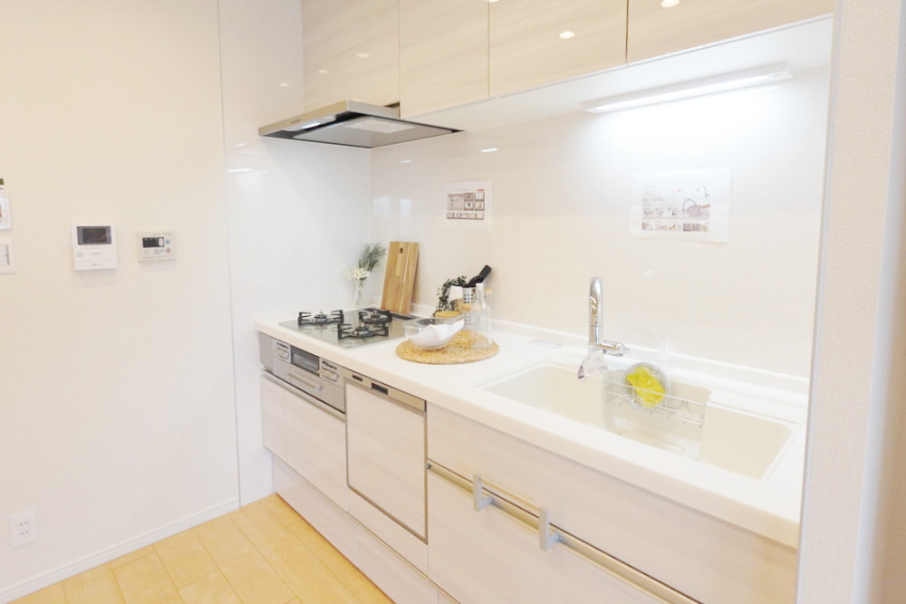■キッチン:システムキッチン(W2100/食洗機付・3口ガラストップコンロ・アクリル人工大理石「アクリストン」ワークトップ&シンク・浄水器付き水栓)
