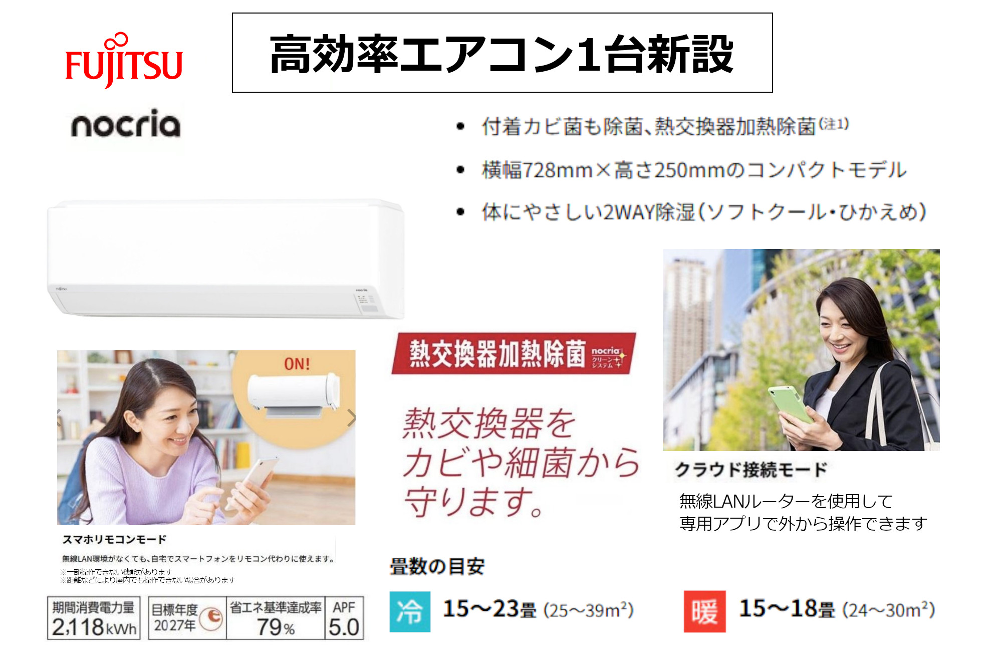 <5.6kw最大23帖用エアコンが1台標準装備!設>富士通のエアコンを1台新設。専用アプリを使ったクラウド接続モードやスマホリモコンモードなど高機能です。