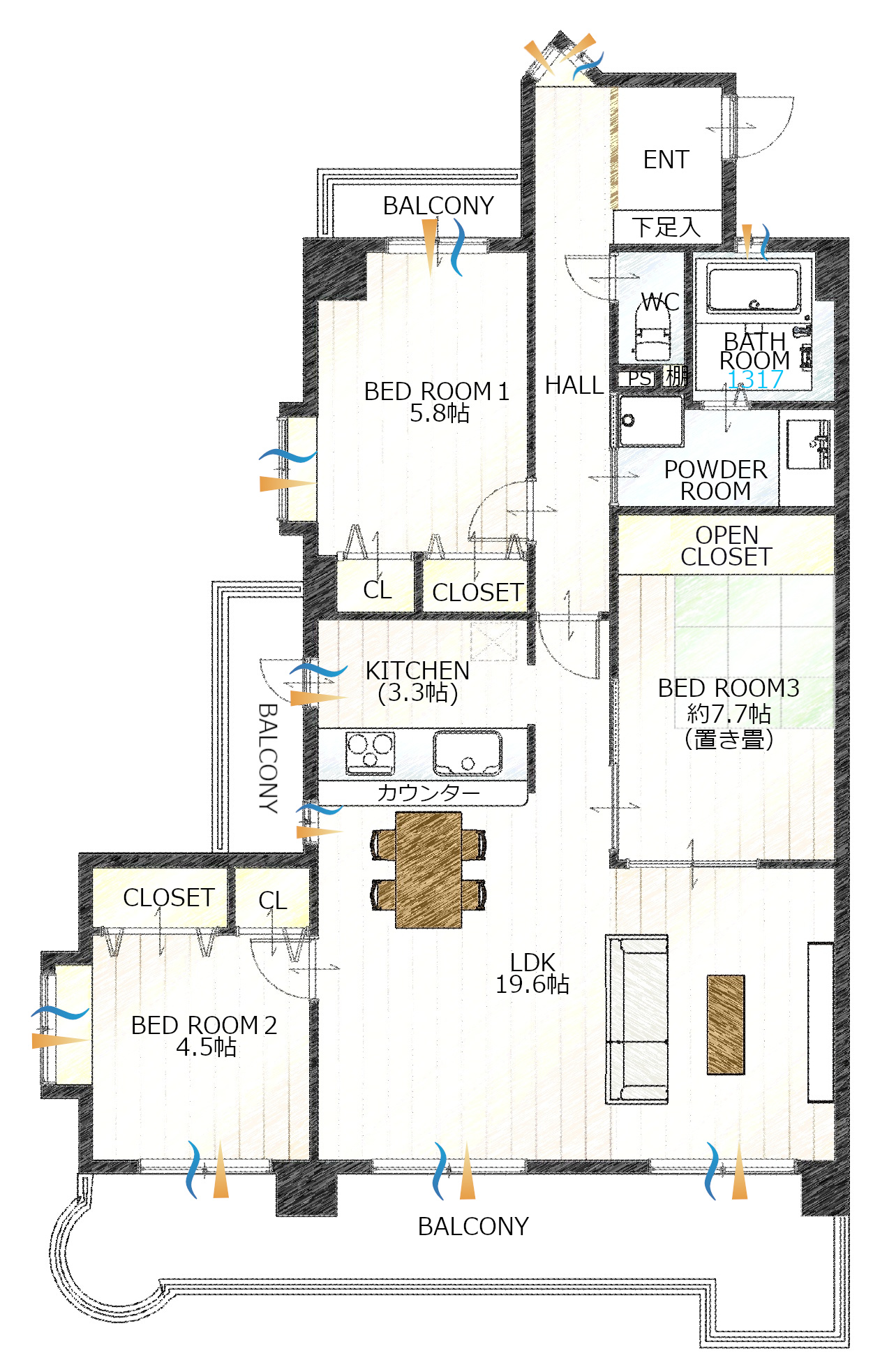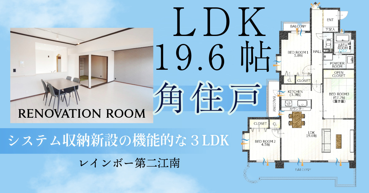 おすすめポイント ①フルリノベーション ②角住戸 ③LDK19.6帖 室内フルリノベーション! キッチン・洗面・ユニットバスは人気のパナソニック製♪ ◇三面採光、三面バルコニー ◇勝手口付きのキッチン&窓付き浴室(1317サイズ) ◇全居室に収納 ◇ペット可(飼育細則あり) ◇5.6kw最大23帖用エアコンが1台標準装備!