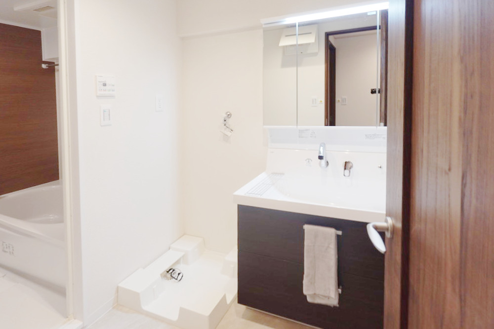 ・LIXIL製洗面化粧台新品交換。幅900サイズ。身支度や家事をラクにするひろびろボウル&くるくる水栓。洗面器は底が広くて大容量。3面鏡は曇り止めコート付き。