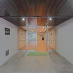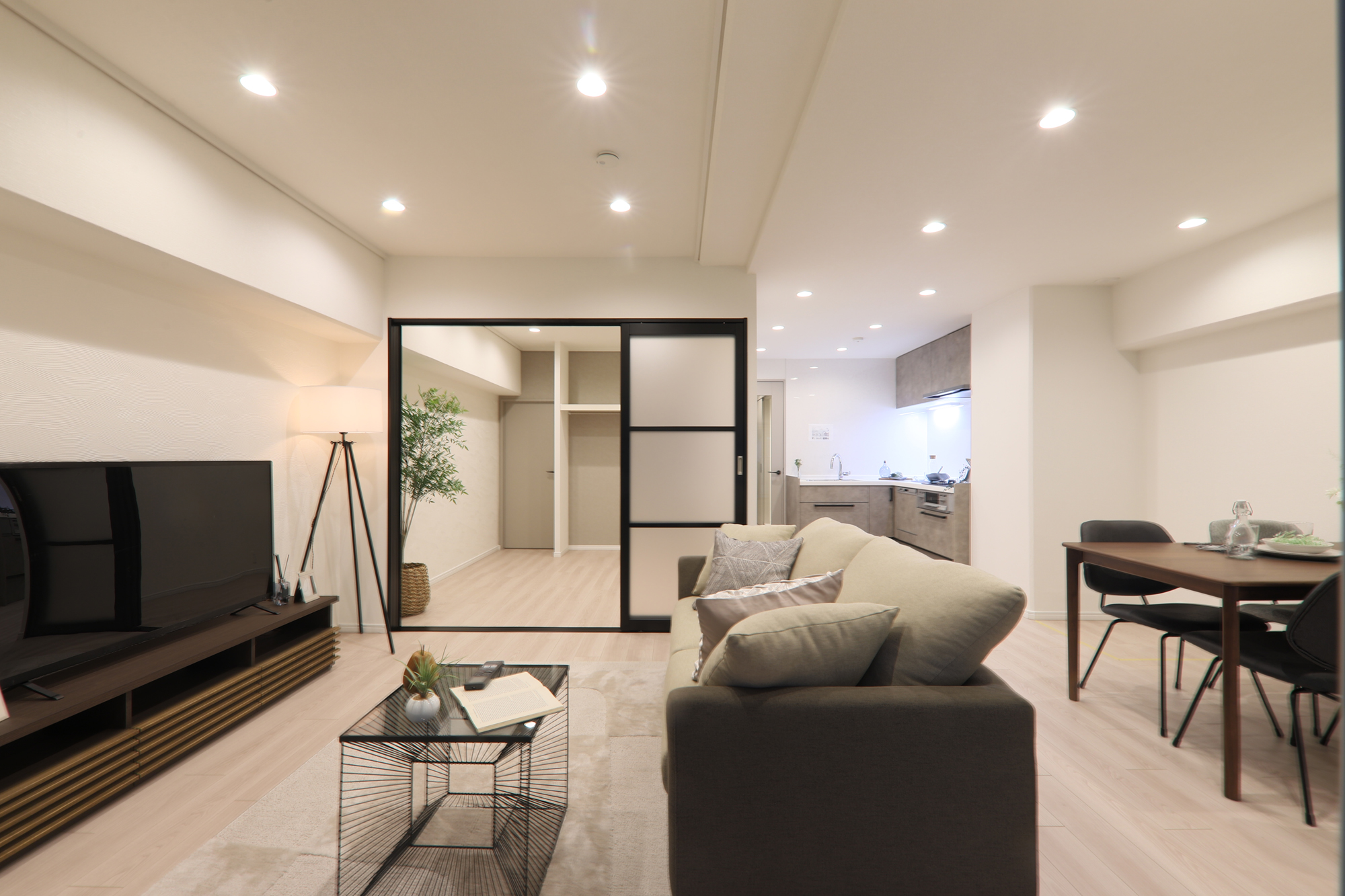 リビング横の洋室には、開放感を演出する大型の透明間仕切りを採用しています。パネルを左右に引いて重ねて納めます。操作がシンプルで出入りもスムーズ。