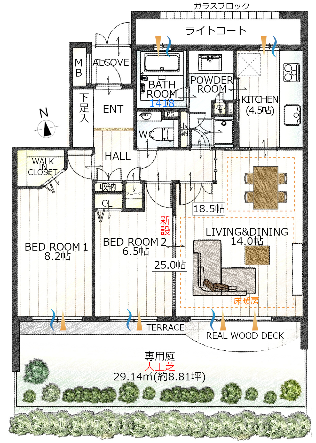 専用庭:29.14㎡(8.81坪)、アルコーブ:2.08㎡(0.62坪)