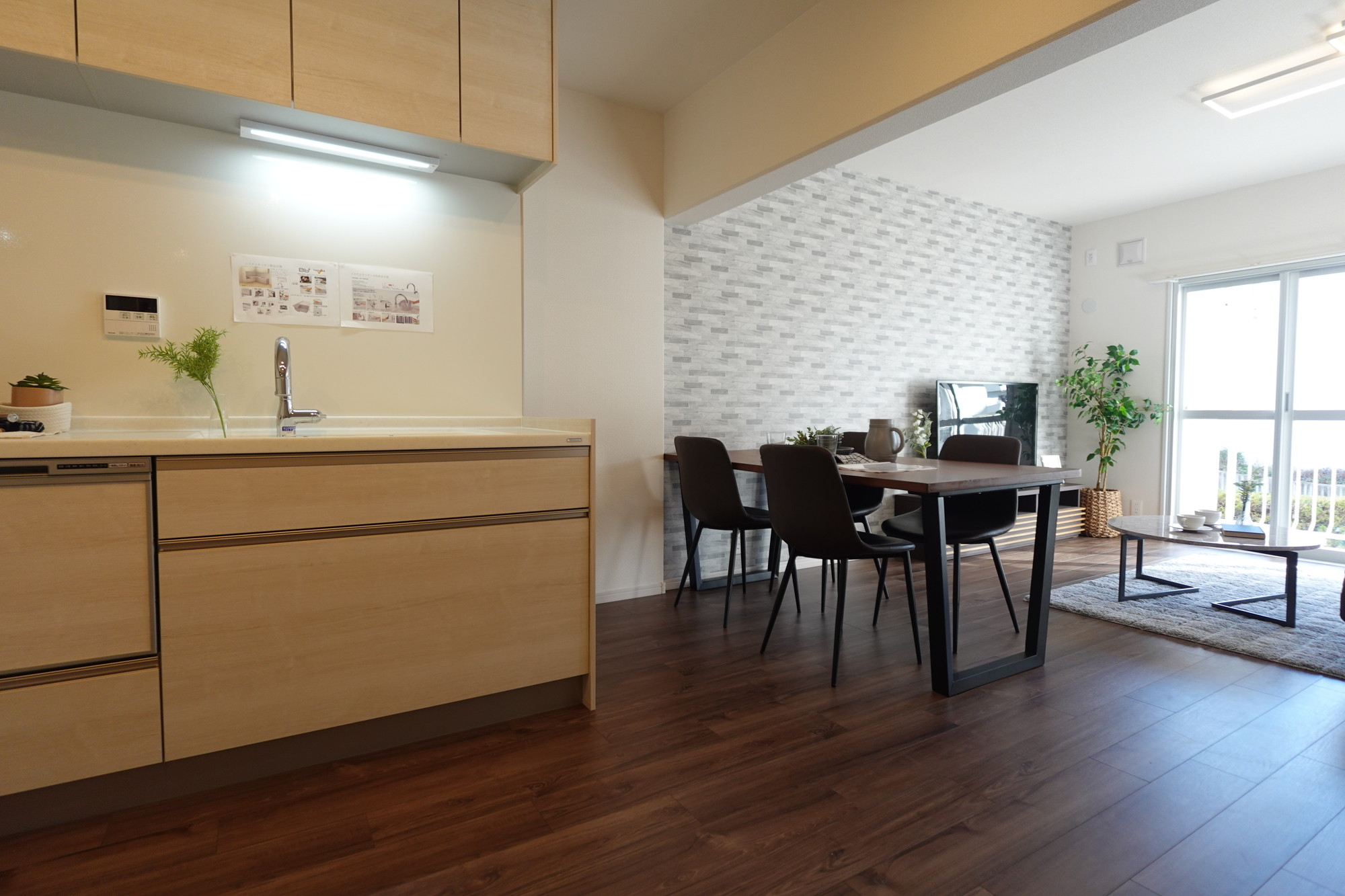 <LDK17.1帖>作業動線が広いL型のシステムキッチン、洗面化粧台、ユニットバス、トイレなど設備新品フルリノベーション。玄関にはシューズインクローゼット新設