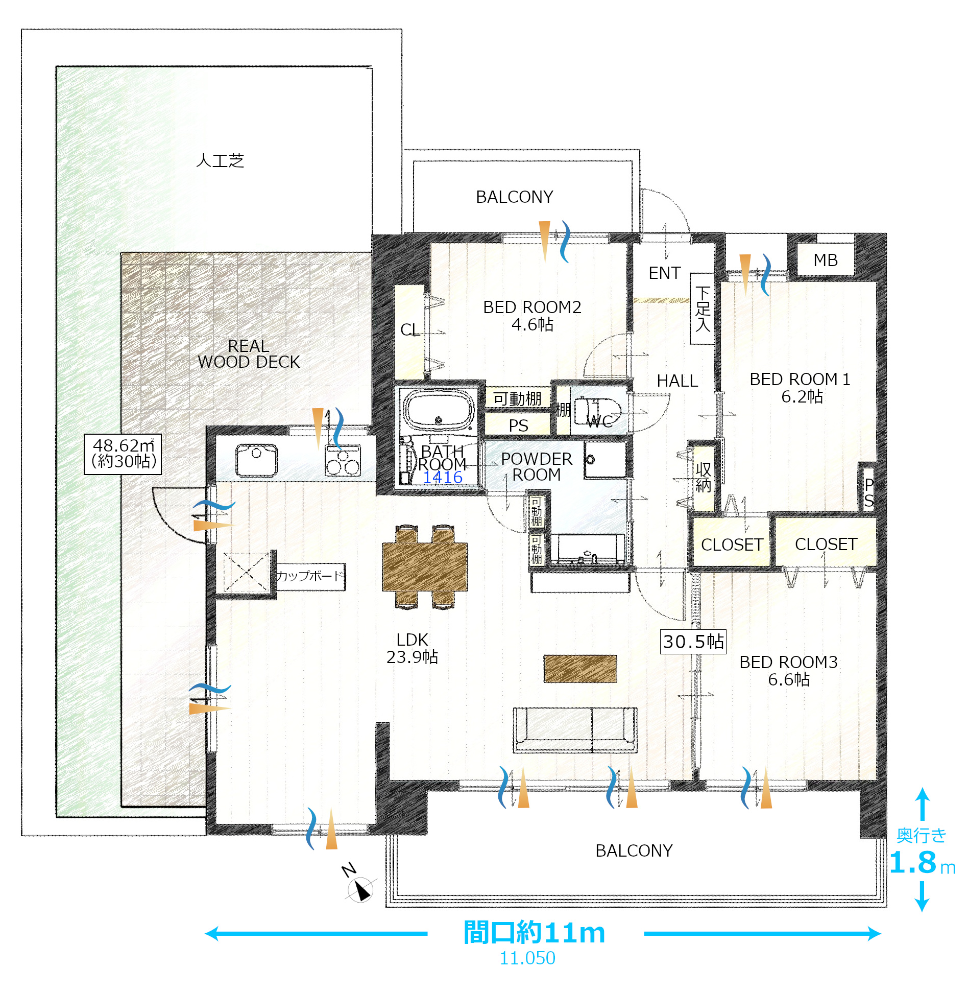 91.76㎡(27.75坪) バルコニー面積: 18.36㎡(5.55) ガーデンテラス面積:48.62㎡(14.7坪) |