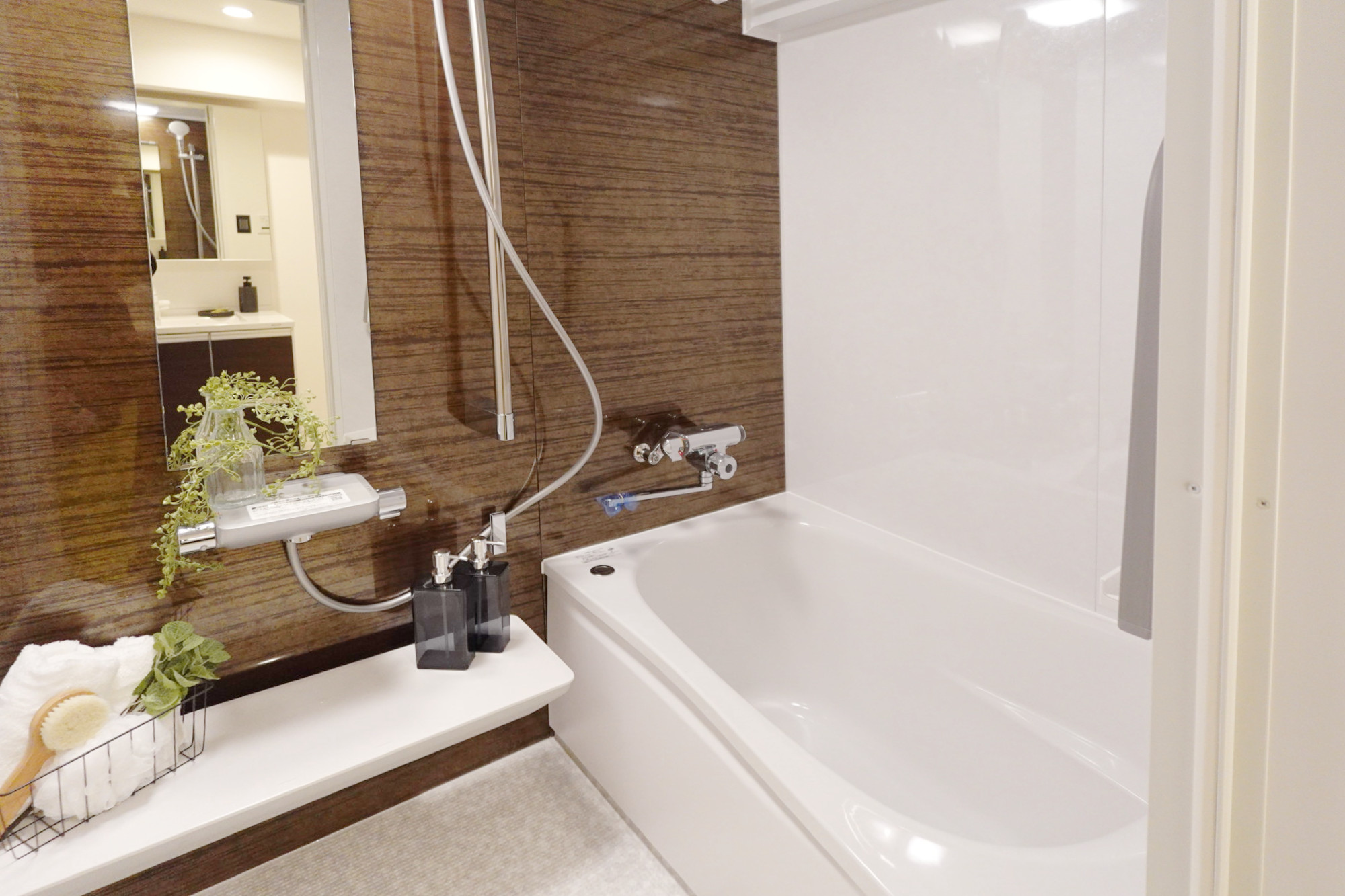 ■LIXILの浴槽:(空気を含んだ水滴が心地よい節水のエコアクアシャワー/汚れにくく冷やっとしないキレイサーモフロア/保温でお湯が冷めにくいサーモバスS)